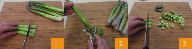 Pour préparer les garganelli au ragoût d'asperges et courgettes, commencez par préparer le bouillon de légumes. Continuez en nettoyant les asperges avec l'économe - éliminez la partie blanche avec un couteau jusqu'à les égaliser 1 et ensuite, avec l'épluche-légumes, retirez la partie externe de la tige, la plus filandreuse 2, et enfin coupez-les en rondelles et laissez les pointes entières 3.