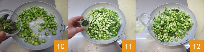 Ajoutez les asperges 10, le thym haché 11 et ajustez le sel et le poivre. Versez ensuite le bouillon et laissez-le cuire pendant 20 minutes à feu doux 12.