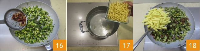 Versez la pancetta croustillante sans l'excès de graisse dans la poêle avec les asperges et les courgettes désormais cuites 16. Maintenant, faites cuire les garganelli dans une grande quantité d'eau salée à votre goût 17, égouttez-les al dente (veillez à conserver 100 g d'eau de cuisson) et versez-les dans le ragoût de légumes 18.