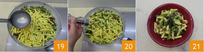 Versez les 100 g d'eau de cuisson 19, ajoutez un tour de moulin de poivre noir 20 et faites sauter pendant quelques secondes, en mélangeant bien. Servez les garganelli au ragoût d'asperges et courgettes bien chauds 21.