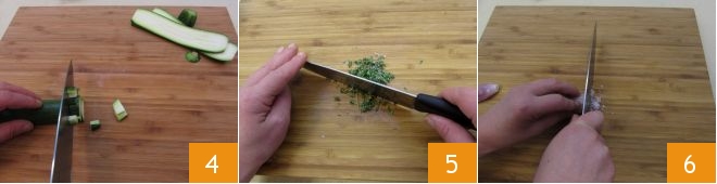 Procédez ensuite au lavage de la courgette, équeutez-la et coupez-la en dés 4. Hachez ensuite le thym 5. Enfin, hachez finement l'échalote, puis commencez à cuire le ragoût de légumes 6.