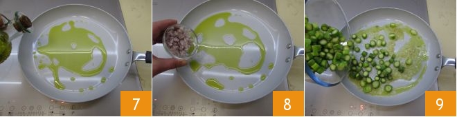 Dans une grande poêle, versez l'huile 7 et faites revenir l'échalote à feu doux 8, puis ajoutez les courgettes, et laissez cuire environ 5 minutes 9.