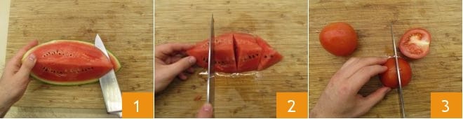 Pour préparer le gaspacho à la pastèque, commencez par nettoyer le fruit. Après avoir retiré la peau 1, coupez la chair en morceaux (il vous en faudra 450 g) 2 et mettez-les dans un bol. Passez aux tomates : détachez-les de la branche, rincez-les, séchez-les et coupez-les en morceaux en éliminant le pédoncule 3.