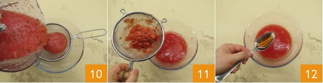 Activez les lames pour obtenir une purée. Transférez-la dans un récipient contenant une passoire 10 et tamisez en écartant les résidus de peaux et de graines 11. Assaisonnez avec du vinaigre de vin rouge 12,
