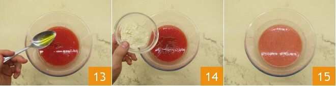 de l’huile 13, du sel, du poivre et de la farine d’amande 14. Mélangez le tout avec un fouet et mettez au réfrigérateur pendant une heure 15.