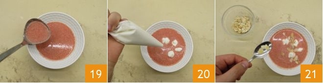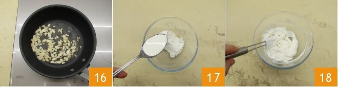Faites griller les amandes dans une petite poêle pendant quelques minutes et réservez 16. Enfin, préparez une crème au fromage en mélangeant la crème 17 avec le fromage de chèvre, mélangez bien et transférez dans une poche à douille 18.