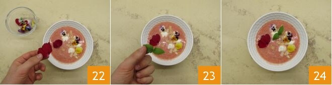 et quelques fleurs comestibles 22. Enfin, une petite feuille de menthe 23 et voilà votre gaspacho à la pastèque est prêt, il ne vous reste plus qu’à le servir froid 24!