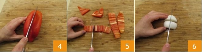 Puis nettoyez le poivron 4 et coupez-le également en gros morceaux 5. Épluchez l’oignon et hachez-le grossièrement aussi 6.