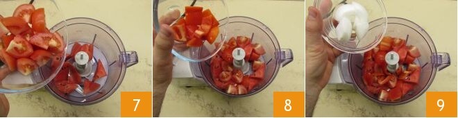 Transférez le tout dans le mixeur : pastèque, tomate 7, poivrons 8 et l’oignon 9.