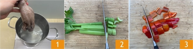 Commencez par faire cuire dans une casserole d'eau bouillante le poulpe pendant 30 minutes ou jusqu'à ce qu'il soit tendre quand vous le piquerez avec une fourchette. Lavez et coupez le céleri 2 et les poivrons rouges 3 en morceaux.