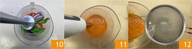 Mixez bien avec un mixeur plongeant pendant quelques minutes 10. Lorsque le mélange est bien mixé 11, passez-le au tamis 12.