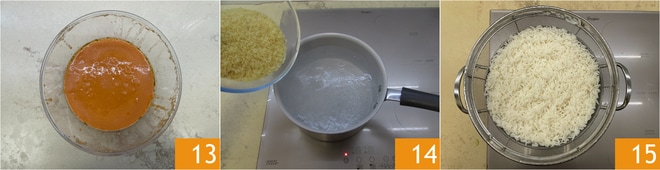 Réservez le gazpacho 13. Maintenant, faites cuire le riz dans de l'eau bouillante salée 14 pendant le temps indiqué sur l'emballage, puis égouttez-le 15.