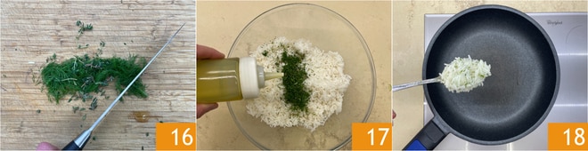 Hachez le fenouil et le thym 16 et ajoutez-les au riz, versez également de l'huile 17 et du poivre. Faites sauter à feu vif pendant quelques minutes le riz dans la poêle 18.