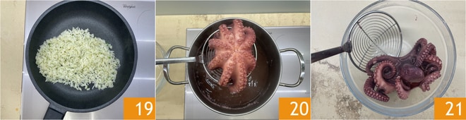 Réservez le riz 19. Le poulpe devrait être cuit à ce stade 20, égouttez-le 21.