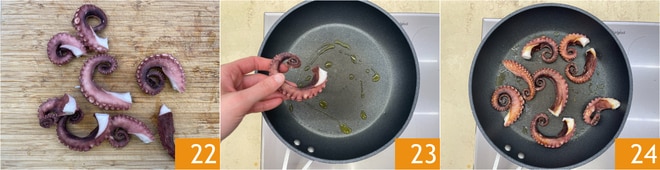 Coupez les tentacules 22. Dans une poêle, chauffez un filet d'huile et déposez les tentacules 23, faites-les bien griller de chaque côté 24.