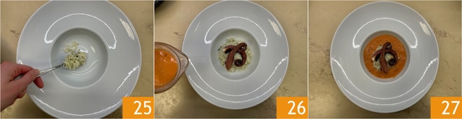 Dressez en créant un dôme central de riz basmati 25, puis deux tentacules au sommet et enfin versez le gazpacho autour 26. Une pincée de poivre et un filet d'huile, le gazpacho de poivrons avec basmati et poulpe est prêt à être servi 27.