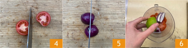 Faites de même avec les tomates grappes 4 puis épluchez et coupez également l'oignon 5. Dans un pichet haut et large (ou dans un bol), placez les légumes que vous avez grossièrement coupés et les tomates cerises entières. Ajoutez le jus de citron vert 6.