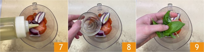 Versez l'huile 7 et le vinaigre 8, du sel, du poivre et du basilic 9.