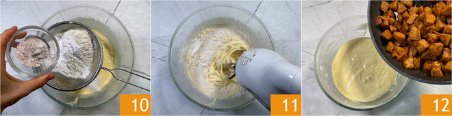 Tamisez ensuite la farine, la fécule et la levure 10. Utilisez à nouveau le batteur à vitesse plus basse pour incorporer les poudres 11, jusqu'à obtenir une pâte homogène. Ajoutez ensuite les deux tiers des pommes sautées 12.