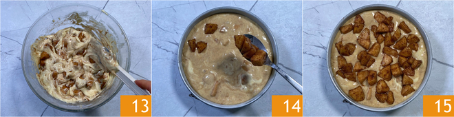 Mélangez avec une spatule pour les incorporer uniformément 13. Transférez la pâte dans un moule de 20 cm de diamètre, beurré et fariné. Lissez la surface et répartissez les pommes restantes 14. Faites cuire dans un four statique préchauffé à 180 °C pendant environ 50-55 minutes, sur la grille du milieu 15.