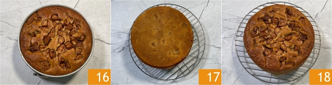 À la fin du temps de cuisson (vérifiez avec un cure-dent), sortez du four et laissez tiédir le gâteau pendant une dizaine de minutes 16 avant de le retourner sur une grille pour le laisser refroidir complètement 17. Votre gâteau 7 pots aux pommes est prêt à être dégusté 18 !