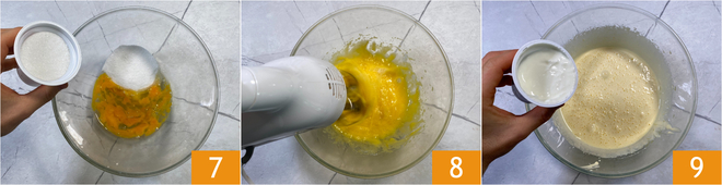 Entre-temps, occupez-vous de la pâte : dans un bol, mélangez les œufs et le sucre 7, puis travaillez avec un batteur électrique pendant 10-15 minutes 8. Quand vous aurez obtenu un mélange gonflé et mousseux, ajoutez l’huile de graines en filet, en maintenant le batteur en marche. À ce stade, versez également le yaourt 9.