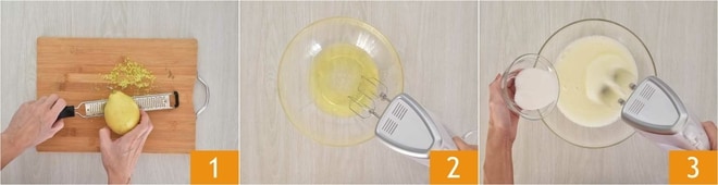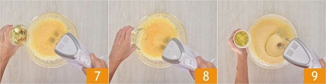 Vous devez obtenir un mélange clair et mousseux. À ce stade, versez l'huile en filet 7 puis l'eau 8, travaillez la pâte pendant quelques secondes, enfin, aromatisez avec le zeste de citron 9.