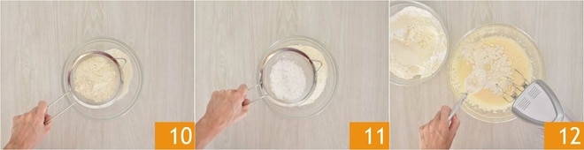 Dans un bol, tamisez la farine 10, la levure et la fécule de maïs 11. Ajoutez les poudres au mélange de jaunes petit à petit, en mélangeant toujours avec les fouets 12.