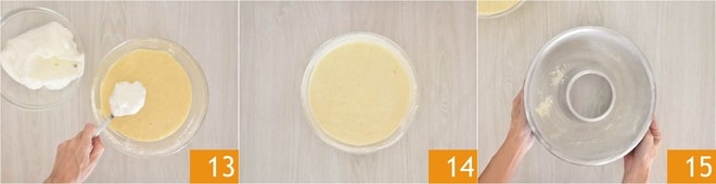 Incorporez enfin les blancs en neige, d'abord avec une paire de cuillères 13, mélangez avec une spatule puis ajoutez le reste en mélangeant délicatement avec des mouvements de bas en haut. La pâte est prête 14. Beurrez et farinez un moule à gâteau de 24 cm de diamètre 15.