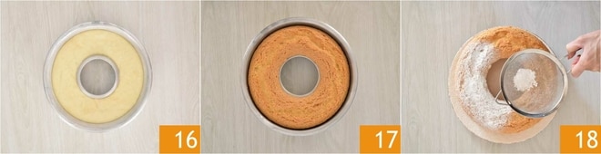 Versez la pâte à l'intérieur 16 et faites cuire au four statique préchauffé à 170° pendant 45-50 minutes sur la grille inférieure du four. Une fois que le gâteau sera cuit, sortez-le du four 17, laissez-le refroidir complètement, démoulez-le et servez-le avec une pincée de sucre glace 18.