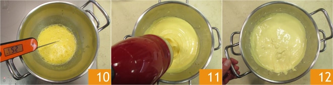 Une fois la bonne température atteinte 10, retirez le bol du bain-marie et fouettez avec un batteur électrique 11 jusqu'à obtenir une consistance mousseuse 12.