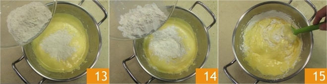 À ce stade, incorporez la farine 13 et la fécule de maïs 14, en mélangeant délicatement avec une spatule 15.