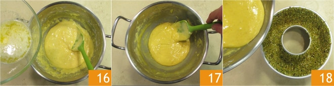Pour réaliser le gâteau à l'orange, commencez par beurrer le moule à gâteau 1 et saupoudrez les morceaux de pistaches 2 de manière à le recouvrir entièrement 3. Mettez de côté et passez à la préparation de la pâte.