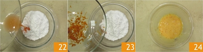 Entre-temps, préparez le glaçage : dans un petit bol, versez le sucre glace et le jus d'orange 22, puis ajoutez le zeste d'orange râpé 23 et mélangez avec un fouet jusqu'à obtenir un mélange fluide et homogène 24.