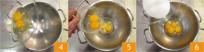 Dans un bol au bain-marie, versez les œufs entiers 4, les jaunes d'œufs 5 et le sucre 6.