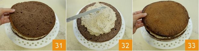 Couvrez avec un autre disque de génoise 31 et badigeonnez-le avec le sirop ; continuez avec une autre couche de crème 32 et enfin placez le dernier disque de génoise 33, en le badigeonnant également avec le sirop. Laissez le gâteau un moment au frais.