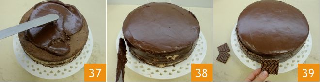 Lorsque la crème ganache maintenue à température ambiante a atteint une consistance fluide, vous pouvez commencer à recouvrir le gâteau ; versez la ganache au centre du gâteau et avec une spatule, étalez-la sur la surface du gâteau 37 et autour 38. Maintenant, vous pouvez passer à décorer avec les gaufrettes enrobées de chocolat au lait en les disposant tout le long de la circonférence du gâteau 39. En plus d'améliorer l'esthétique, les gaufrettes positionnées à l'extérieur seront utiles pour portionner plus facilement votre gâteau.