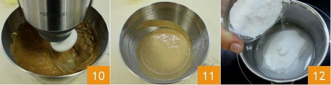 Montez ensemble les ingrédients 10 jusqu'à obtenir une crème lisse et homogène 11 que vous garderez de côté, hors du frigo mais au frais, pendant que vous continuez la préparation. Consacrez-vous ensuite à la préparation de la meringue italienne qui sera enrichie avec la crème à la noisette : dans une petite casserole, versez l'eau et ajoutez 75 g de sucre 12. Allumez le feu doux et mélangez de temps en temps pour faire fondre le sucre.