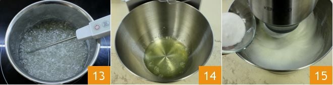 Vérifiez la température du sirop avec un thermomètre alimentaire : il ne doit pas dépasser les 121°. Lorsqu'il atteint 116° 13, vous pouvez commencer à monter les blancs d'œufs. Versez-les dans le bol d'un batteur 14 et montez-les en ajoutant les 25 g de sucre restants 15.