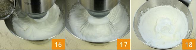 Lorsque le sirop atteint les 121°, retirez-le du feu et en continuant de monter les blancs d'œufs, ajoutez le sirop bouillant en filet 16 ; vous devrez monter les blancs d'œufs avec le sirop 17 jusqu'à ce que le mélange soit complètement froid, pour obtenir une meringue souple 18.