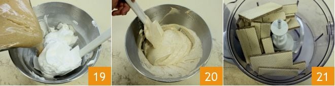 Lorsque la meringue est bien froide, arrêtez les fouets et ajoutez la crème de noisette 19, en mélangeant les deux mélanges délicatement de bas en haut avec une spatule 20. Ensuite, dans un mixeur, versez les gaufrettes à la noisette 21.