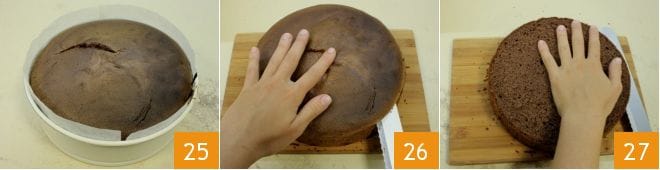 Après 45 minutes, vous pouvez sortir la génoise au cacao du four 25. Laissez-la complètement refroidir, puis démoulez-la et placez-la sur une planche à découper pour obtenir trois disques de 1 cm d'épaisseur chacun, en vous aidant d'un couteau à lame fine. Pour cette opération, vous pouvez également consulter l'École de cuisine : comment couper la génoise. Ensuite, procédez en obtenant le premier disque 26 puis passez à diviser à nouveau le reste de la génoise 27.