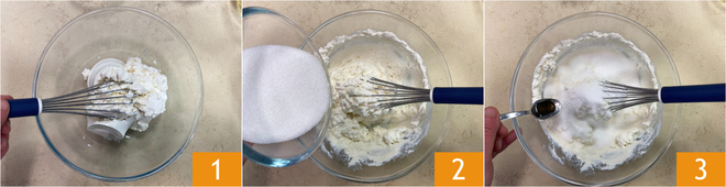 Pour préparer le gâteau à la ricotta et au cacao sans farine, commencez par travailler la ricotta à l'aide d'un fouet 1. Dans le même bol, ajoutez le sucre 2 et l'extrait de vanille 3.