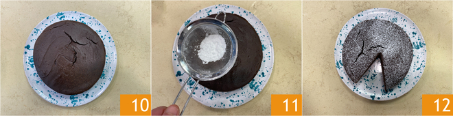 Une fois le temps de cuisson écoulé, sortez le gâteau du four et laissez-le refroidir dans le moule avant de le démouler 10. Enfin, décorez avec du sucre glace 11. Votre gâteau à la ricotta et au cacao sans farine est prêt à être dégusté 12 !