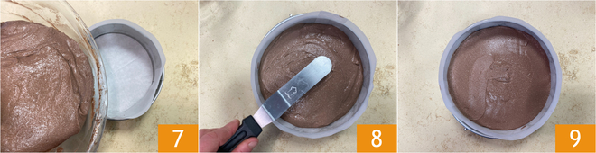 Versez le mélange dans un moule de 20 cm, préalablement beurré et recouvert de papier cuisson 7. Nivelez soigneusement la surface 8 et enfournez dans un four ventilé à 170° pendant environ 60 minutes 9.
