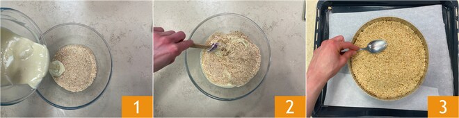 Pour préparer le gâteau à la ricotta et aux myrtilles, commencez par faire fondre le chocolat blanc sans dépasser 40°C. Émiettez les biscuits puis mélangez le tout 1 2. Tapissez un cercle de 22 cm de diamètre avec de l'acétate, faites bien adhérer la base de biscuits et de chocolat, d'environ 4 cm de hauteur 3 et placez au réfrigérateur pour environ 30 minutes.