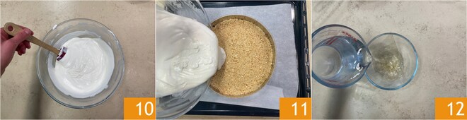 Ajoutez les 100 g de crème demi-montée et mélangez encore 10. Versez sur la base 11 et laissez durcir 3 heures au réfrigérateur. Pour la gelée de myrtilles : faites tremper les feuilles de gélatine dans de l'eau froide 12.