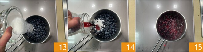 Dans une casserole, versez les myrtilles, le sucre 13 et le vin rouge 14. Faites cuire pendant environ 5-10 minutes, puis éteignez le feu 15.