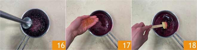 Mixez 16, ajoutez la gélatine essorée 17 et mélangez pour faire fondre 18.