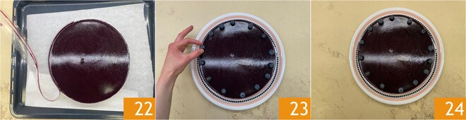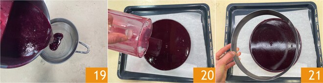 Passez la gelée au tamis 19 pour la rendre plus fluide puis versez-la sur le gâteau 20. Remettez le dessert au réfrigérateur pendant 2 heures pour qu'il durcisse. Ensuite, retirez le cercle 21.